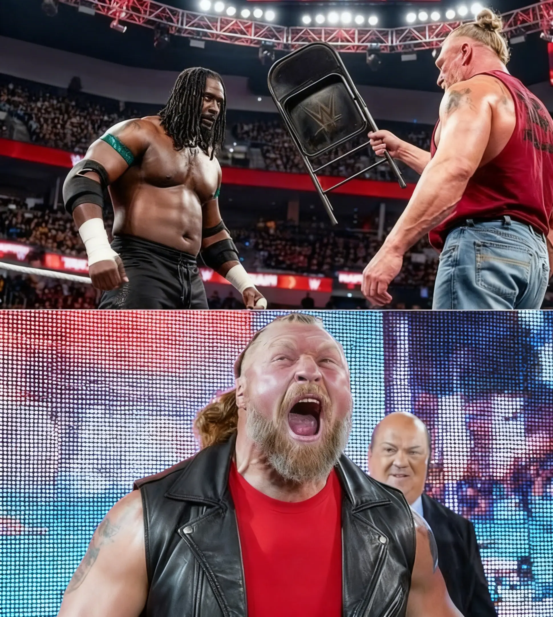Sans aucun avertissement, Brock Lesnar s’est emparé d’une chaise en acier qui se trouvait près du ring. Le public a poussé des cris en réalisant ce qui allait se passer. L’éclat du métal sous les lumières du stade augmentait le sentiment de danger. Il ne s’agissait pas d’une simple confrontation physique ; Cela allait devenir un acte de destruction brutale.