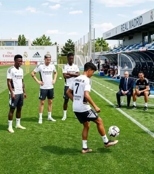 La presencia de Vinícius, Camavinga y Valverde como “espectadores de lujo” es el detalle que eleva la escena. Ellos representan el presente más brillante: la velocidad, el músculo y la garra. Que ellos se detengan a observar al “Junior” es la validación definitiva de que el chico no es solo un nombre mediático, sino un talento que exige atención. En este 2026, el Madrid ha consolidado su proyecto de jóvenes galácticos, y la inclusión (aunque sea imaginaria) de Cristiano Jr. es la pieza que cierra el círculo de la realeza blanca.