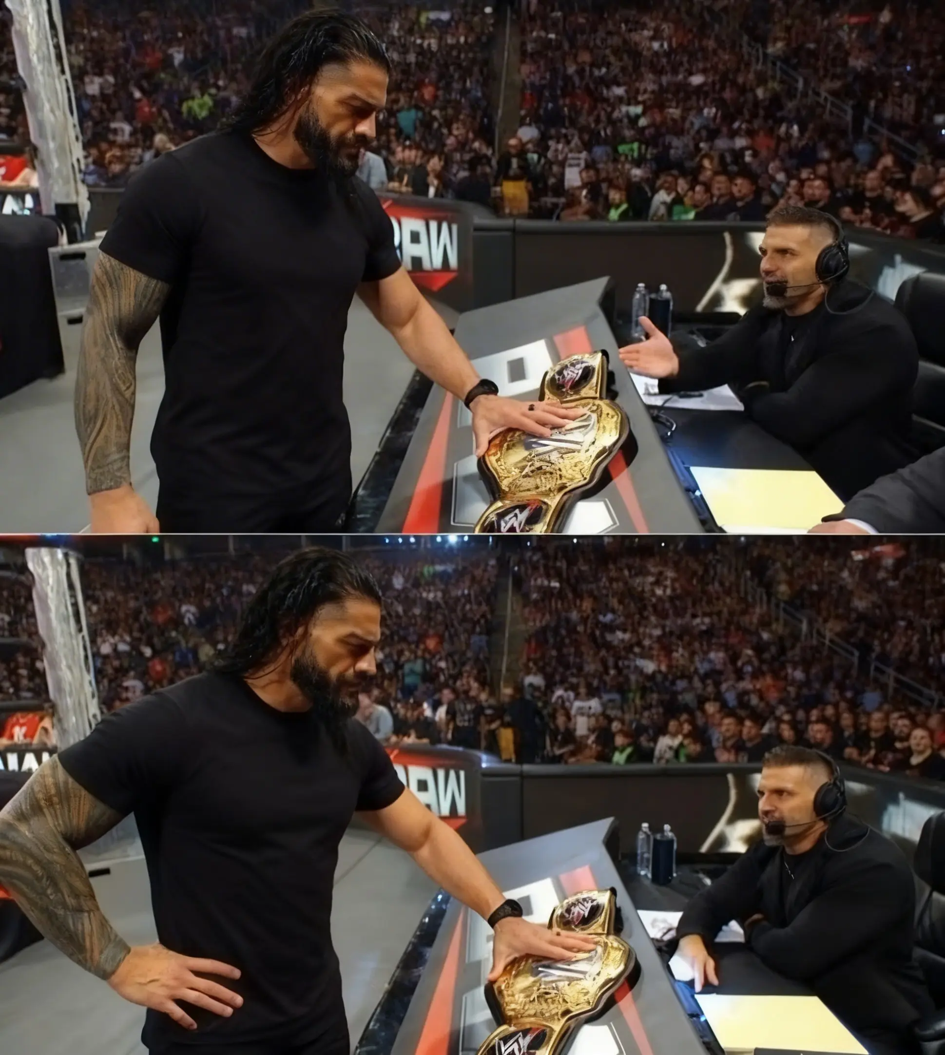 Cuando finalmente subió al ring, el silencio se volvió casi absoluto. Roman se detuvo frente al campeonato y lo observó durante varios segundos. Ese momento de pausa fue quizás lo más impactante de toda la escena. No era una mirada casual; era la mirada de alguien que reconoce exactamente lo que ese título representa. Poder. Autoridad. Dominio absoluto.
